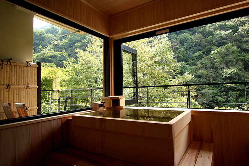 窓の外からは、時間の流れを忘れさせてくれる四季折々の山々があります。心と体がやすらぐお部屋となっております。